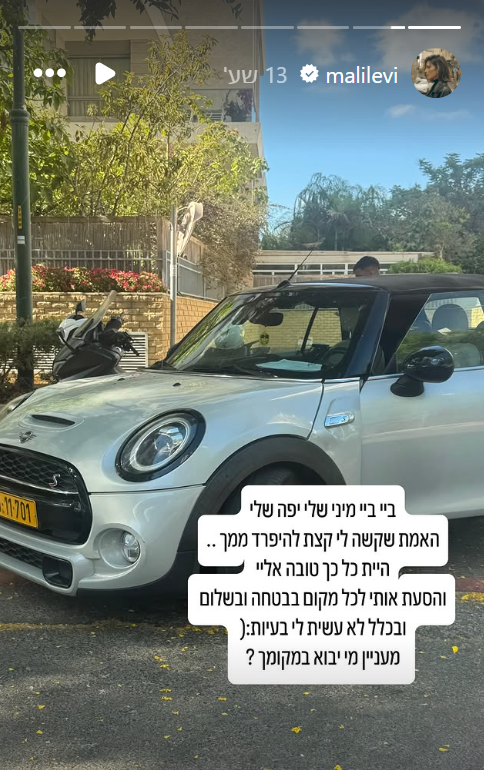 כעת היא משתפת כי היא מתחדשת ברכב חדש. אבל לפני שהוא יגיע היא לא שוכחת להיפרד מהרכב הקודם שלה, מיני קופר. לוי העלתה סטורי ובו כתבה מילות פרידה לאוטו שליווה אותה בתקופה יחסית ארוכה וכתבה כך: "ביי ביי מיני שלי, יפה שלי. האמת שקצת קשה לי להיפרד ממך... היית כל כך טובה אליי. והסעת אותי לכל מקום בבטחה ובשלום. ובכלל לא עשית לי בעיות. מעניין מי יבוא במקומך?".