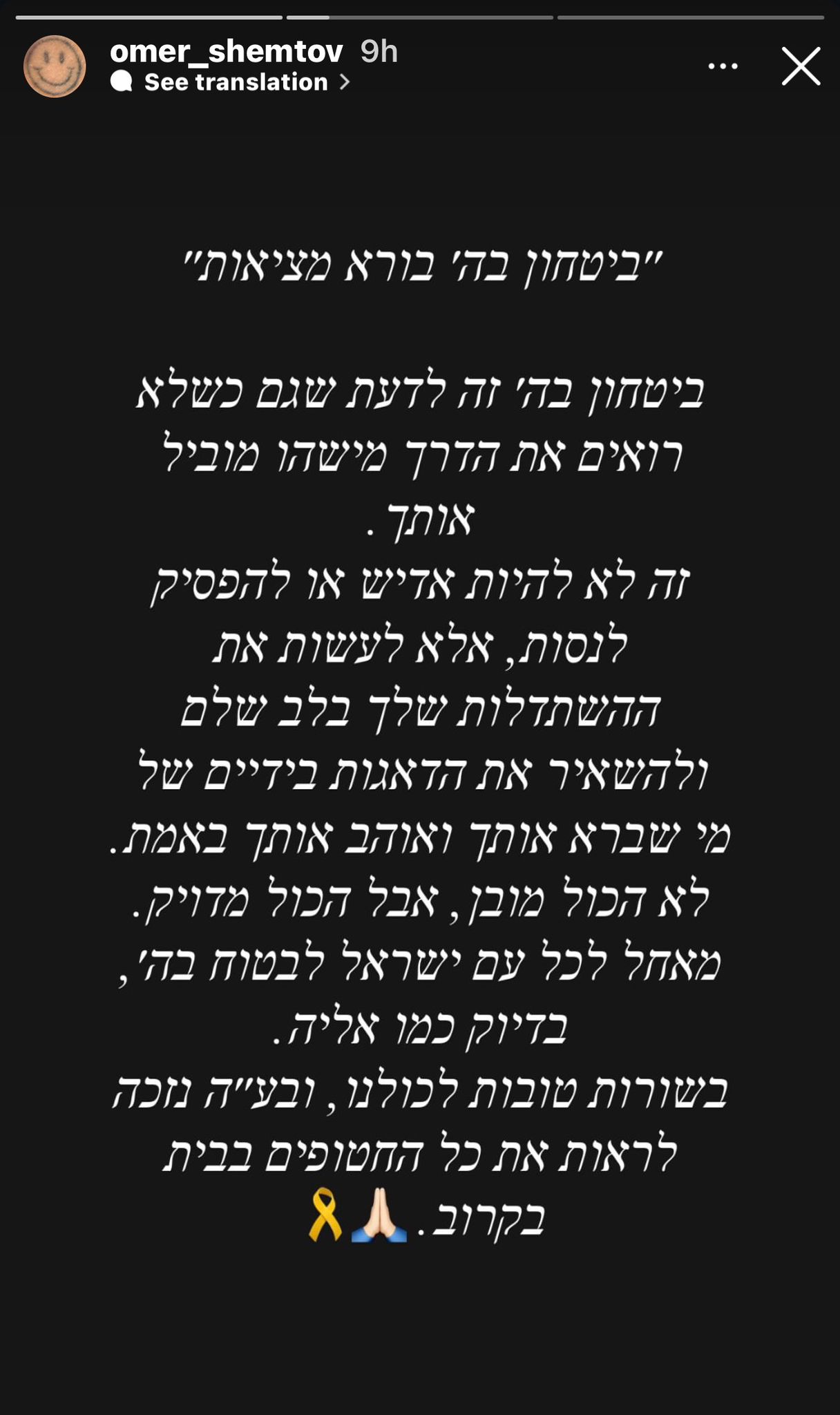 זה לא להיות אדיש או להפסיק לנסות, אלא לעשות את ההשתדלות שלך בלב שלם, ולהשאיר את הדאגות בידיים של מי שברא אותך ואוהב אותך באמת. לא הכל מובן, אבל הכל מדויק. מאחל לכל עם ישראל לבטוח בה’, בדיוק כמו אליה. בשורות טובות לכולנו, ובעז”ה נזכה לראות את כל החטופים בבית בקרוב" וצירף אימוג'י תפילה וסמל החטופים".