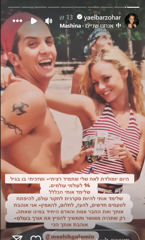 יעל בר זוהר העלתה תמונות נוסטלגיות ומשותפות של שניהם, וכתבה באינסטגרם לעיני עשרות אלפי העוקבים: "היום יום הולדת לאח שלי שתמיד רציתי - ושזכיתי בו בגיל 14 לעולמי עולמים. שלימד אותי הכלל. שלימד אותי להיות סקרנית לחקור עולם, להיפתח לטעמים חדשים, להעז, לחלום, להאמין - אני אוהבת אותך ואת החבר אמת והאדם היחיד במינו שאתה. רק שתהיה מאושר ותמשיך להפיץ את אורך בעולם - אוהבת אותך הכי".