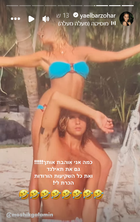 "כמה אני אוהבת אותך!!! גם את תאילנד ואת כל השקיעות הורודות שהכרת לי", הוסיפה בר זוהר בסטורי נוסף שהקדישה למנחה הטלוויזיה.