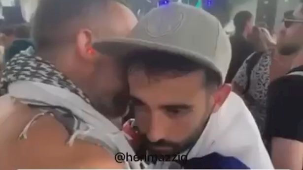 ישראלי ופלסטיני מתחבקים בטומורולנד, צילום מתוך חשבון ה-X של HenMazzig@