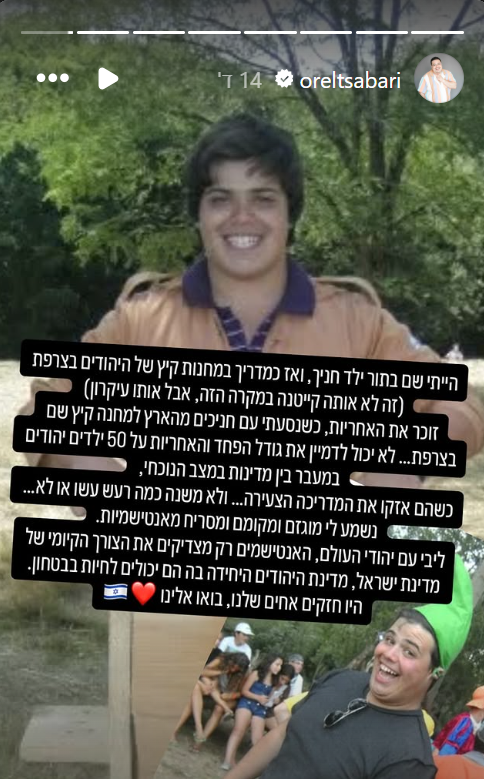 לאחר מכן בסטורי הבא כותב צברי על חוויותיו כמדריך נוער בצרפת: "הייתי שם בתור ילד חניך ואז כמדריך במחנות קיץ של היהודים בצרפת (זה לא אותה קייטנה במקרה הזה, אבל אותו עיקרון) זוכר את האחריות כשנסעתי עם חניכים מהארץ למחנה קיץ שם בצרפת... לא יכול לדמיין את גודל הפחד והאחריות על 50 ילדים יהודים במעבר בין מדינות במצב הנוכחי, כשהם אזקו את המדריכה הצעירה .. ולא משנה כמה רעש עשו או לא נשמע לי מוגזם ומקומם ומסריח מאנטישמיות. ליבי עם יהודי העולם, האנטישמים רק מצדיקים את הצורך הקיומי של מדינת ישראל, מדינת היהודים היחידה בהם הם יכולים לחיות בביטחון. היו חזקים אחים שלנו, בואו אלינו".