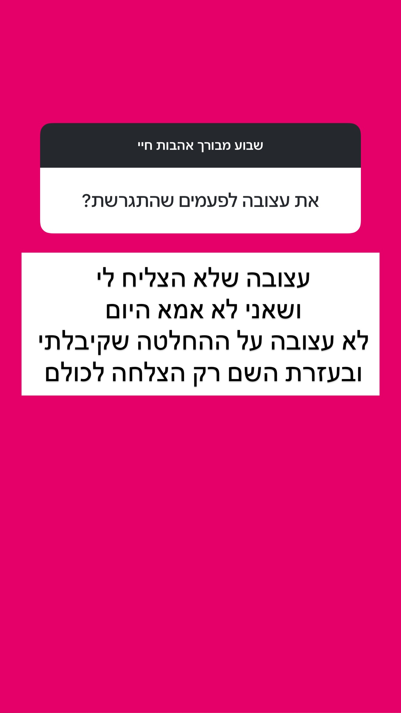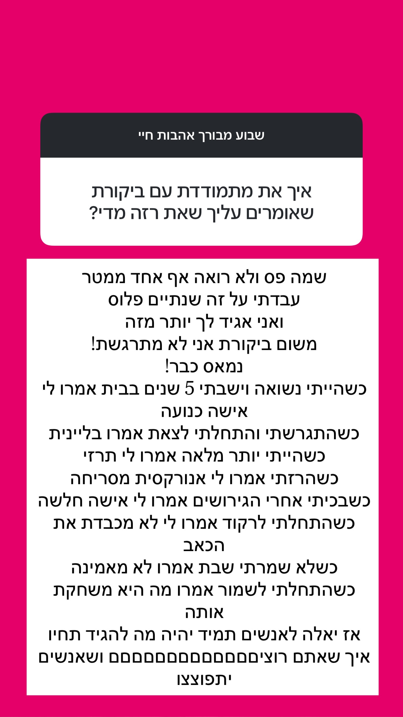 כשבכיתי אחרי הגירושים, אמרו לי אישה חלשה. כשהתחלתי לרקוד, אמרו לי שאני לא כבדת את כאב. כשלא שמרתי שבת, אמרו לי שאני לא מאמינה. כשהתחלתי לשמור, אמרו; 'מה היא משחקת אותה'. לאנשים תמיד יהיה מה להגיד. תחיו איך שאתם רוצים ושאנשים יתפוצצו".