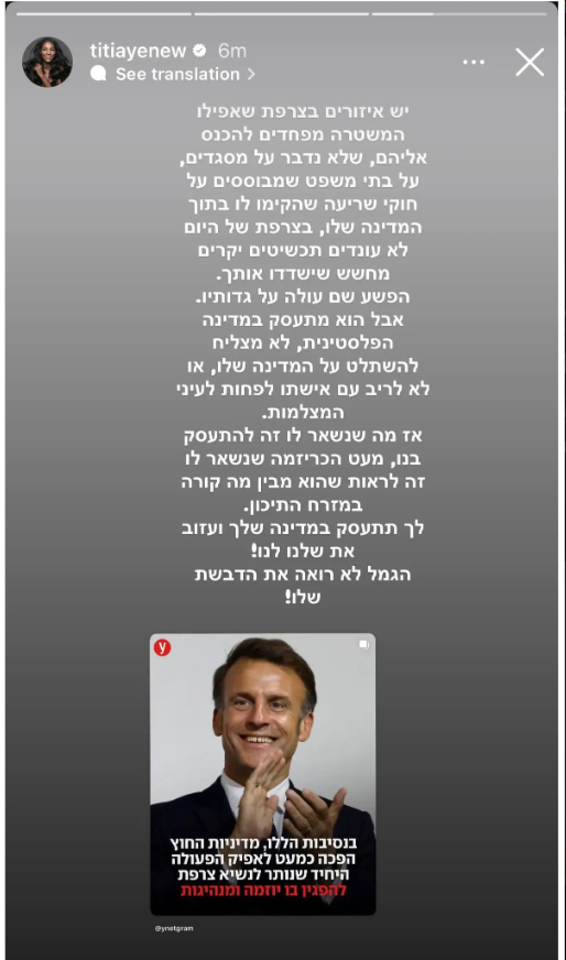 ההכרזה עוררה את זעמה של מלכת היופי לשעבר טיטי איינאו, שפרסמה סטורי באיסטגרם שעבר על נקודות רגישות של הנשיא הצרפתי: מהמצב הביטחוני במדינתו ועד הסטירה שחטף מאשתו לעיני המצלמות.