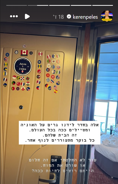 בהמשך שיתפה כי בחדר ממולה ישנה משפחה שהחליטה לגור על האונייה: "הם מטיילים ככה בכל העולם. זה הבית שלהם. כל בוקר מתעוררים לנוף אחר. עוד לא החלטתי אם זה חלום או שורט את המוח. הייתם רוצים להיות ככה?".