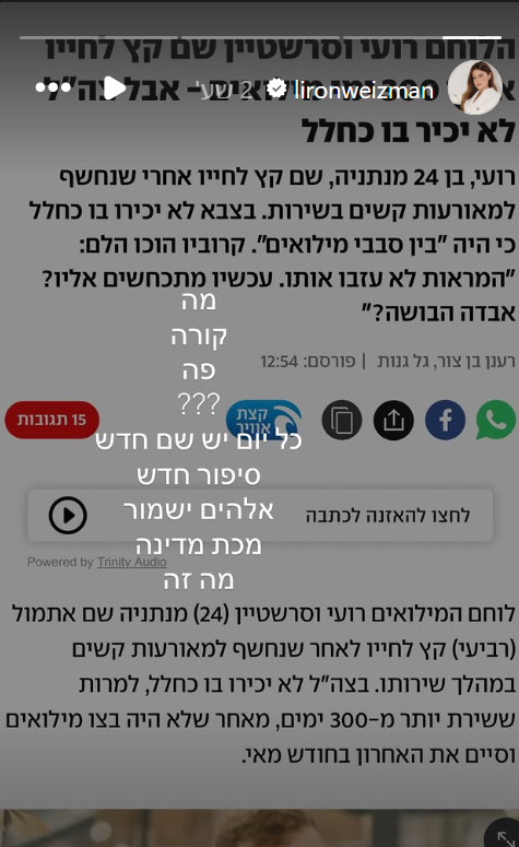 מגישת "האח הגדול" ברשת 13 מתייחסת לבשורות הקשות על מותו של לוחם המילואים מנתניה: "מה קורה פה?"