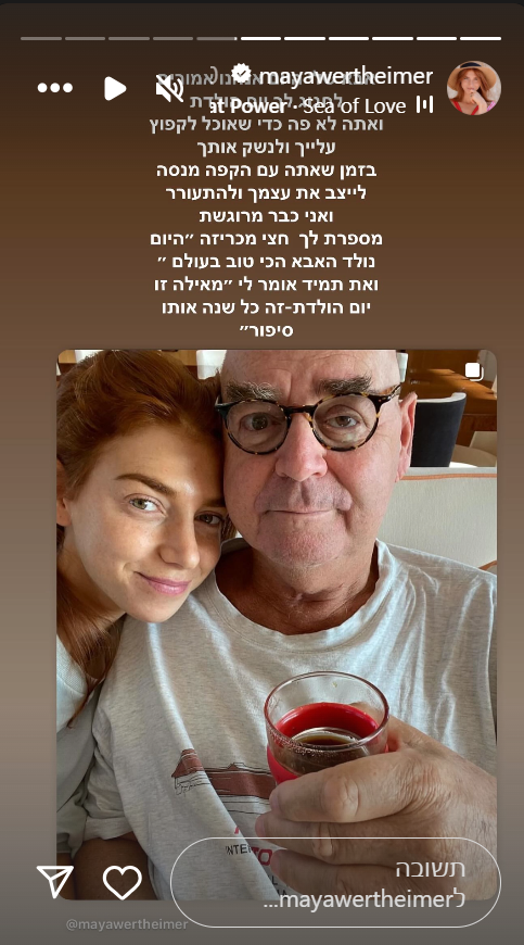 אבל אז הגיע תאריך יום הולדתו של אביה איתן ורטהיימר ז"ל, והיא כתבה עליו בהתרגשות ובגעגועים רבים. בסטורי שפרסמה היום (שבת) שיתפה סטורי עם תמונה ישנה איתו וכתבה: "אבא שלי היום אנחנו אמורים לחגוג לך יום הולדת. ואתה לא פה כדי שאוכל לקפוץ עלייך ולנשק אותך בזמן שאתה עם הקפה מנסה לייצג את עצמך ולהתעורר ואני כבר מורגשת מספרת לך חצי מכריזה 'היום נולד האבא הכי טוב בעולם' ואתה תמיד אומר לי 'מאילה זו יום הולדת ' זה כל שנה אותו סיפור'".