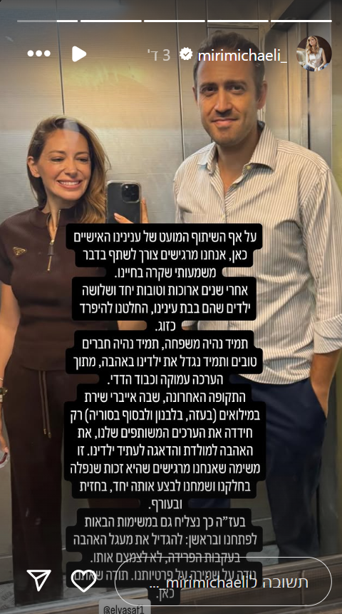 בן זוגה של מירי מיכאלי שיתף את הסטורי שלה בחשבון האינסטגרם שלו לכל עוקביו והוסיף עם אימוג'י של לב: "זה מסר מאיתנו".