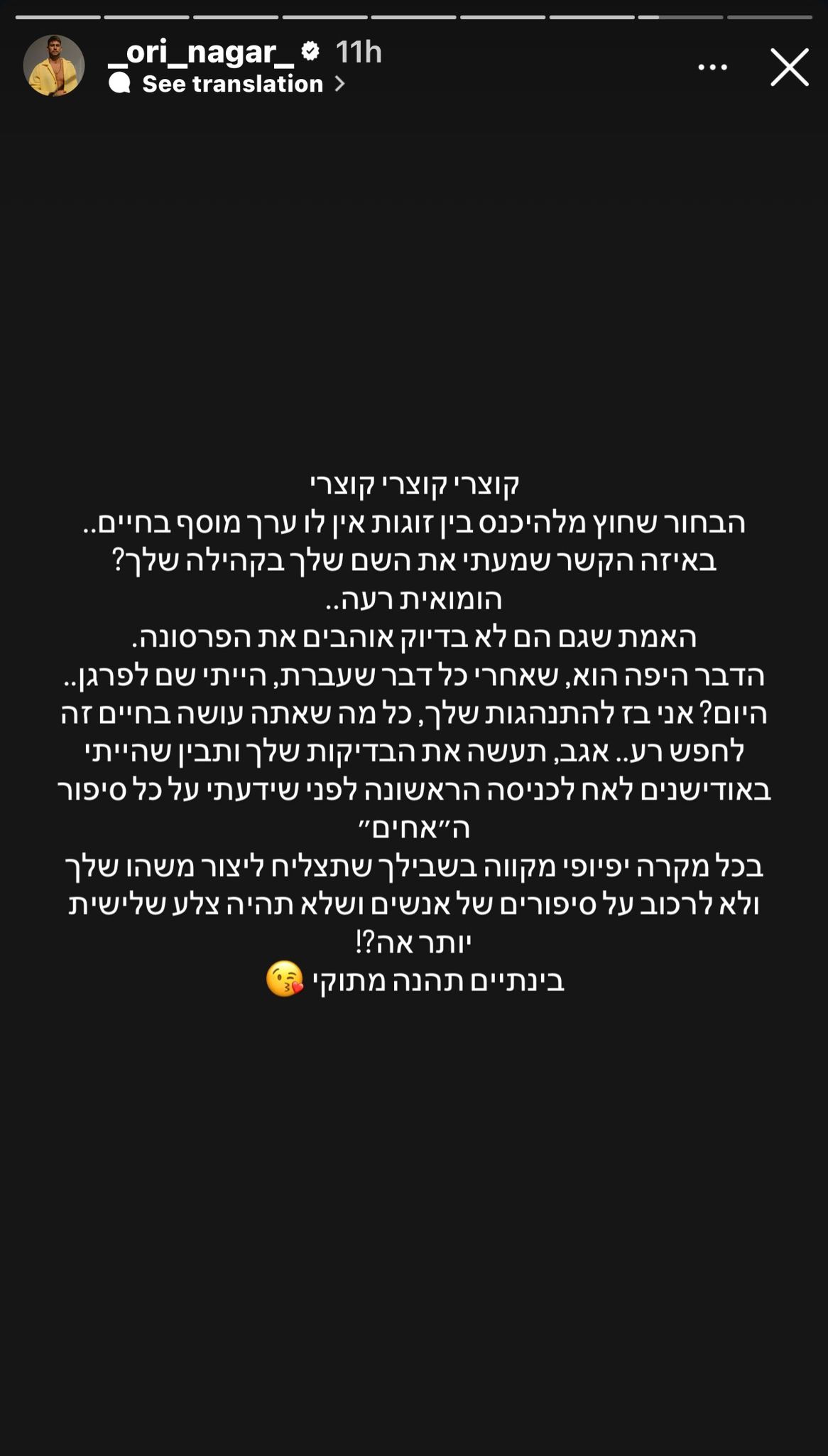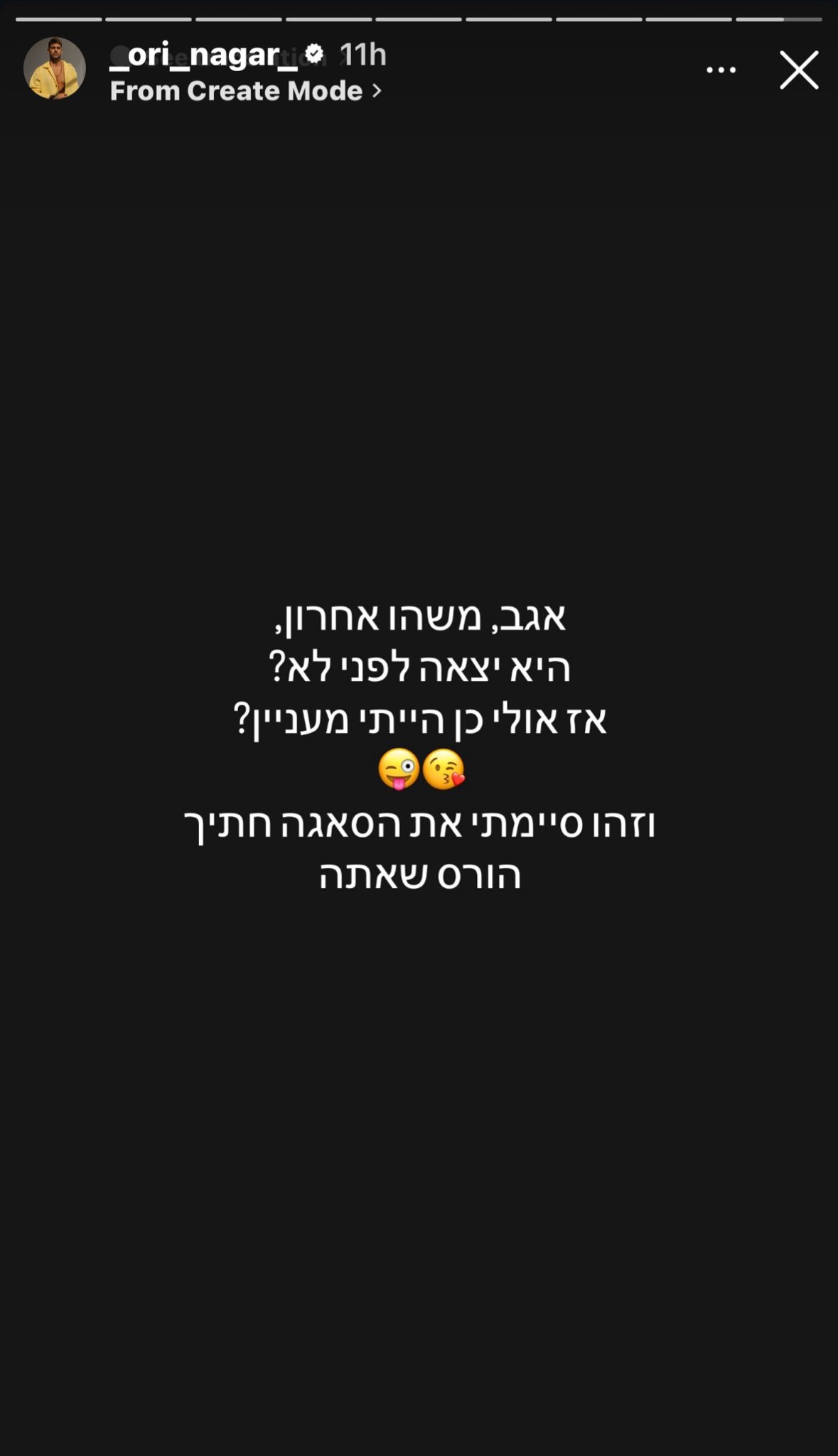 בנוסף, המשיך לעקוץ נגר: "אגב, משהו אחרון, היא יצאה לפני לא? אז אולי כן הייתי מעניין? וזהו סיימתי את הסאגה חתיך, הורס שאתה".