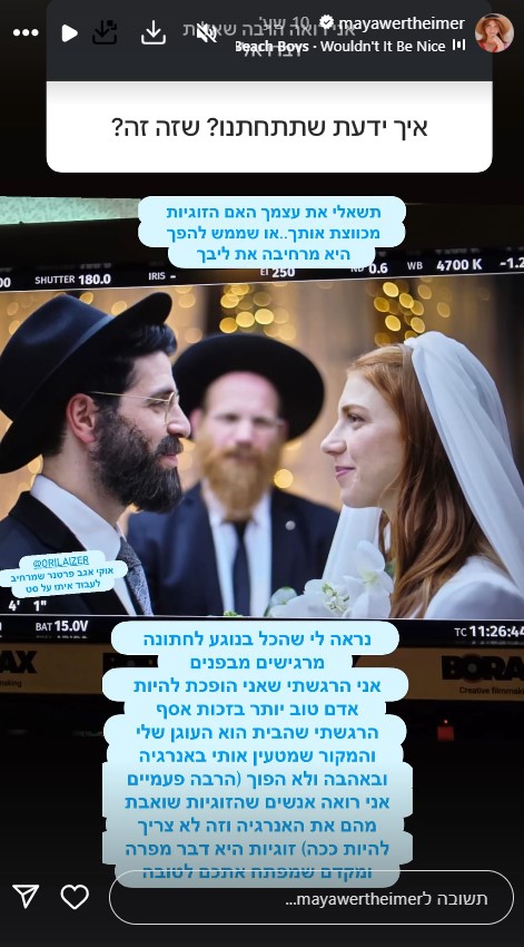 "תשאלי את עצמך האם הזוגיות מכווצת אותך... או שממש להפך היא מרחיבה את ליבך. נראה לי שהכל בנוגע לחתונה מרגישים מבפנים. אני הרגשתי שאני הופכת להיות אדם טוב יותר בזכות אסף.