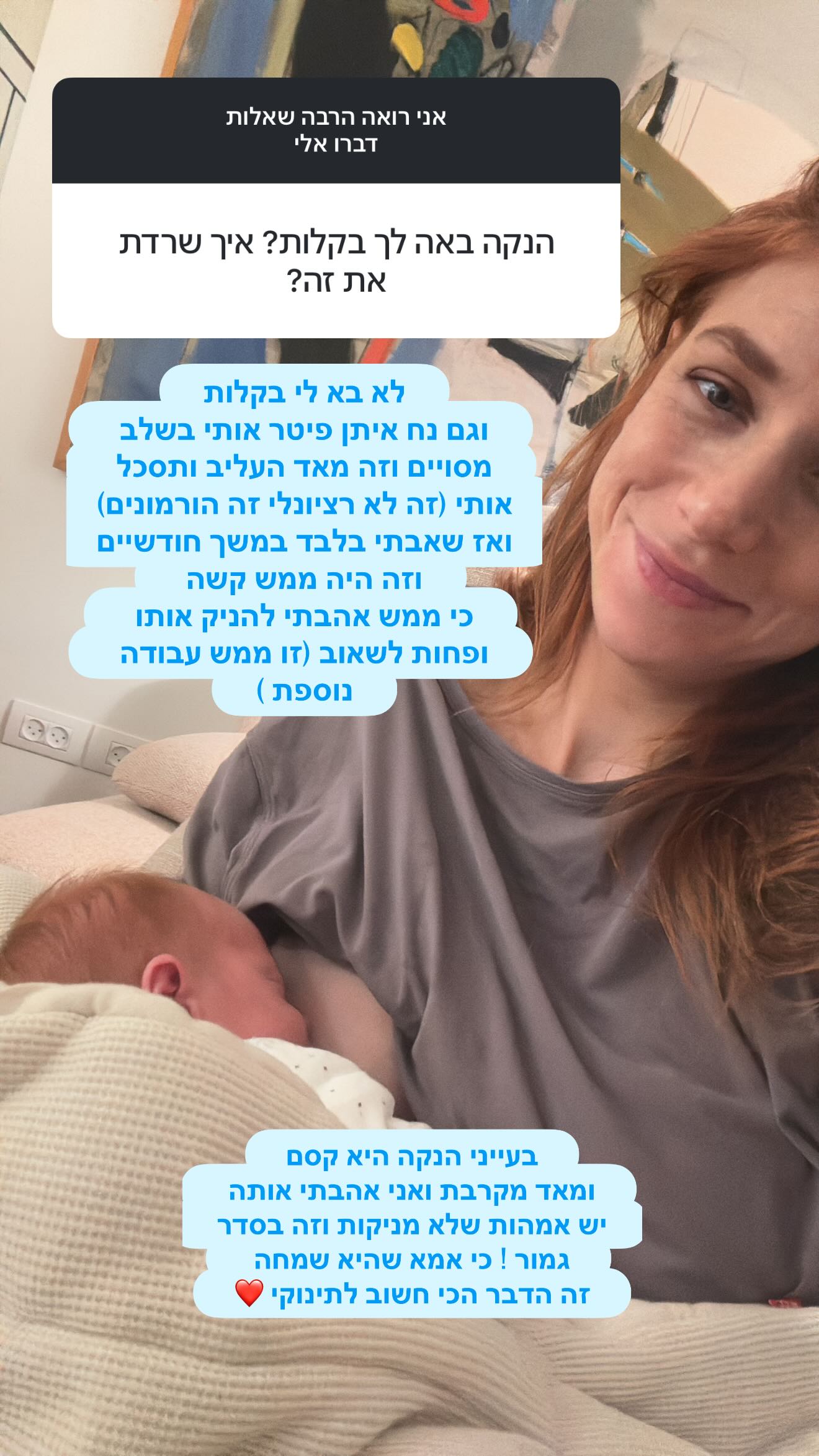 בהמשך, נשאלה הכוכבת הישראלית כיצד היא חווה את תהליך ההנקה עם בנה הפעוט. "זה לא בא לי בקלות וגם נח איתן פיטר אותי בשלב מסוים וזה מאוד העליב ותסכל אותי. (זה לא רציונלי, אלו הורמונים) ואז שאבתי בלבד במשך חודשיים וזה היה ממש קשה, כי ממש אהבתי להניק אותו ופחות לשאוב (זו ממש עבודה נוספת)", שיתפה ורטהיימר.