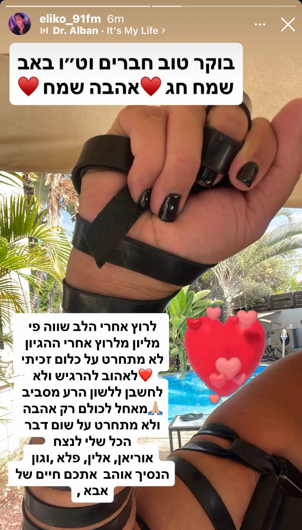 כך שיתף אליקו בתחילת הסטורי: "בוקר טוב חברים וט"ו באב שמח חג אהבה שמח". והחל לעקוץ ברמזים לאקסית ארז: "לרוץ אחרי הלב, שווה פי מיליון מלרוץ אחרי ההיגיון. לא מתחרט על כלום, זכיתי לאהוב, להרגיש, ולא לחשבן ללשון הרע מסביב. מאחל לכולם רק אהבה, ולא מתחרט על שום דבר, הכל שלי לנצח: אוריאן, אלין, פלא וג'ון הנסיך, אוהב אתכם חיים של אבא".