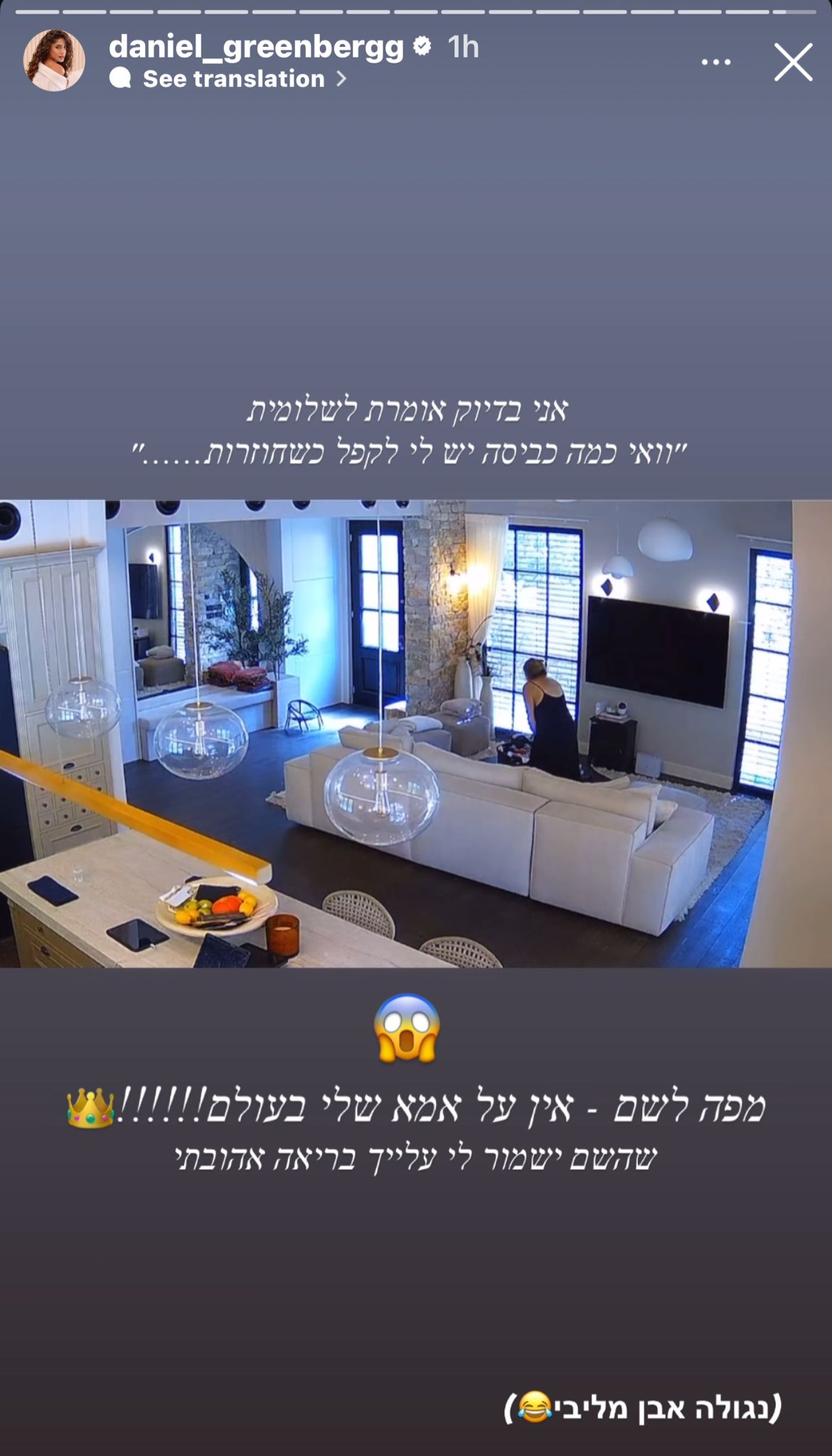 היום (שני) שיתפה גרינברג בסטורי את רגע האהבה החדש בחייה, הפעם מצד אמה שהגיעה לסדר לה את הבית. כך כתבה גרינברג בסטורי: "אין על אימא שלי בעולם! שהשם ישמור לי עלייך בריאה אהובתי", את הדברים הללו אמרה לזאת שלצידה, כפי ששיתפה: "אני בדיוק אומרת לשלומית 'וואי כמה כביסה יש לי לקפל כשחוזרות'"; צפו בסטורי.