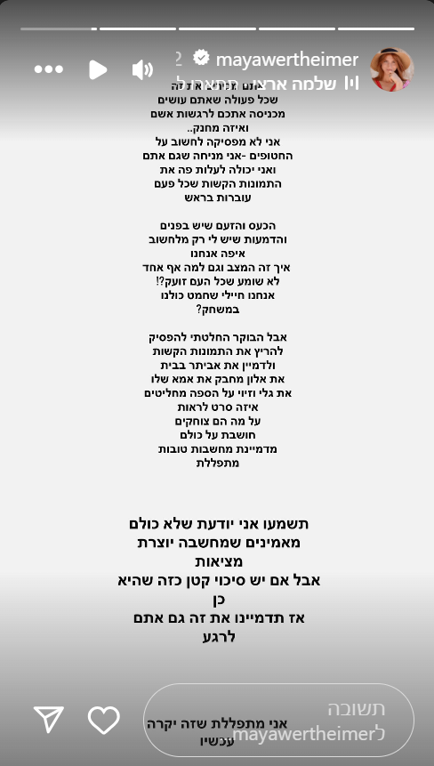 לאחר ששיתפה את הכעס והזעם שהיא חשה, ניסתה ורטהיימר דווקא לייצר תמונה אופטימית ולשתף כי היא מדמיינת את החטופים חוזרים הבייתה. "אני יודעת שלא כולם מאמינים שמחשבה יוצרת מציאות אבל אם יש סיכוי קטן כזה שהיא כן, אז תדמיינו את זה גם אתם לרגע. אני מתפללת שזה יקרה עכשיו".