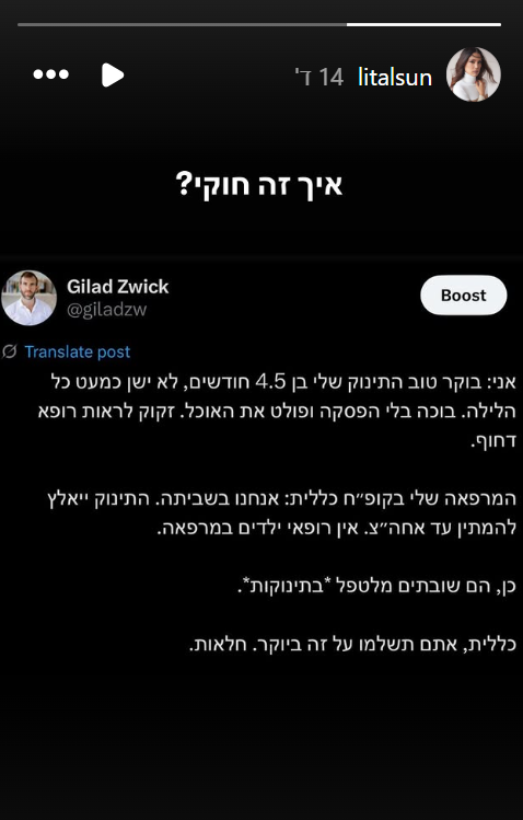 בציוץ ששיתפה שמש נכתב: "התינוק שלי לא ישן כמעט כל הלילה, בוכה בלי הפסקה ופולט את האוכל. זקוק לראות רופא דחוף. המרפאה שלי בקופת חולים כללית: אנחנו בשביתה התינוק ייאלץ להמתין עד אחה"צ. אין רופאי ילדים במרפאה".