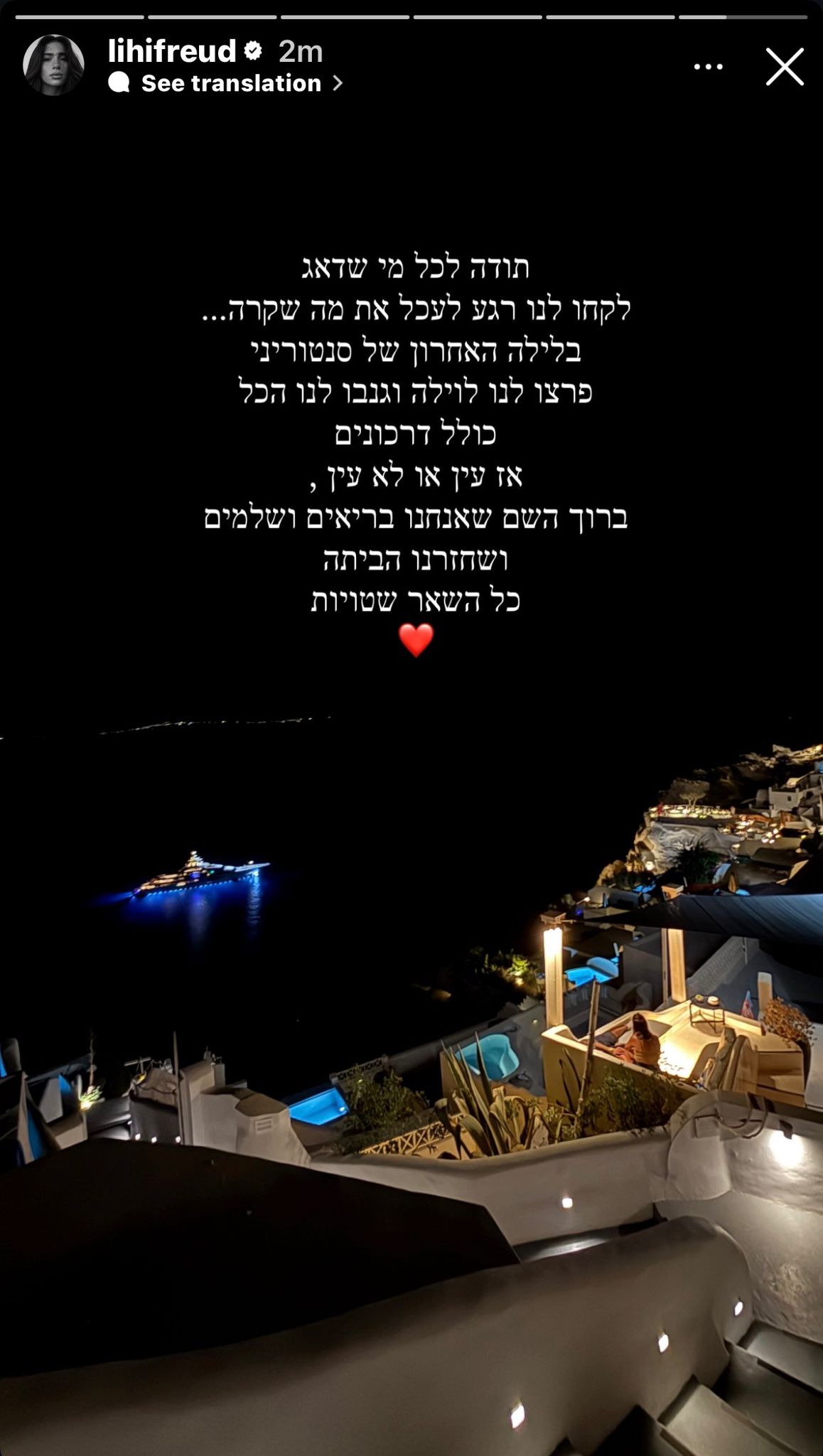 הרקדנית ליהי פרויד, אחת הרקדניות האהובות בתעשייה, שהיא גם אקסית לא מעט מפורסמים, שיתפה היום (שני) בגניבה שעברה בחופשה ביוון, יחד עם בן הזוג נתן רבינוביץ', בסטורי חדש: "לקח לנו רגע לעכל את מה שקרה.. בלילה האחרון של סנטוריניט, פרצו לנו לוילה וגנבו לנו הכל, כולל דרכונים. אז עין או לא עין, ברוך השם שאנחנו בריאים ושלמים ושחזרנו הביתה, כל השאר שטויות" וצירפה אימוג'י לב אדום; צפו.
