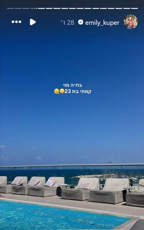 היום (חמישי) אמילי קופר חוגגת את יום הולדתה ה-23 עם בן זוגה עידן גלפר, אותו הכירה בבית "האח הגדול". בבוקר שיתפה קופר תמונה מגג של בניין שנראה כמו מלון, עם בריכה. היא כתבה בסטורי: "בוז'ה מוי. קמתי בת 23".