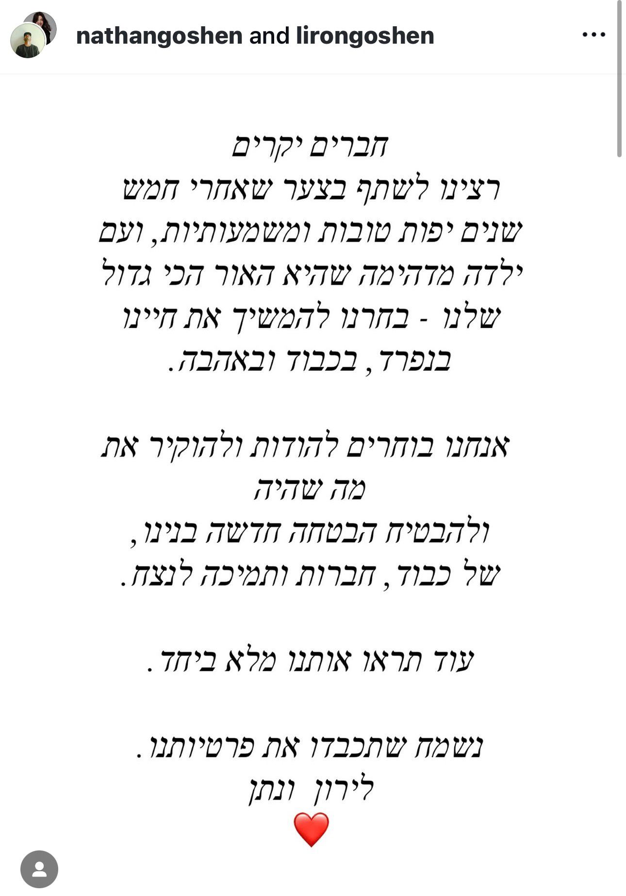 נתן גושן ואשתו לירון החליט להתגרש לאחר 5 שנות נישואים וילדה משותפת, בפוסט משותף שהתפרסם היום (ראשון), כתבו השניים: ""רצינו לשתף בצער שאחרי חמש שנים יפות ומשמעותיות, ועם ילדה מדהימה שיעור הכי גדול שלנו, בחרנו להמשיך את חיינו בנפרד, בכבוד ואהבה. אנחנו בוחרים להודות ולהוקיר את מה שהיה ולהבטיח אבטחה חדשה בינינו, של כבוד, חברות ותמיכה לנצח. עוד תראו אותנו מלא ביחד"; צפו בסטורי המשותף.