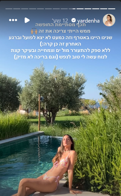 הראל, מגישת תוכנית הבוקר ברשת 13, שיתפה תמונות מהחדר במלון שנראה כמו סויטה קטנה שבה הם נהנו מסלון, חדר שינה, מרפסת ובריכה פרטית צמודה לחדר.