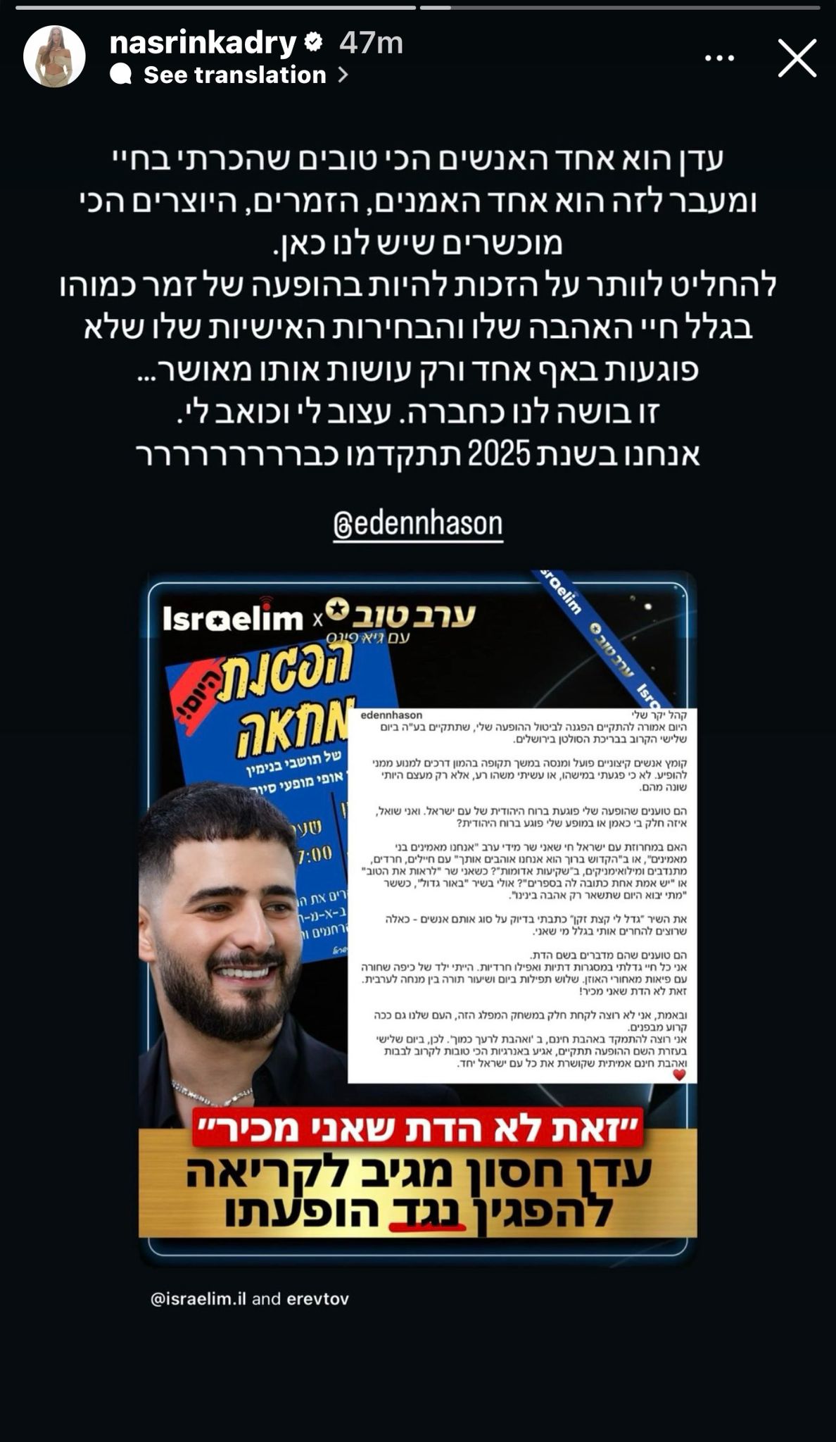 אלו חלק מהדברים שאמר, והיום נסרין קדרי התייצבה לצידו והגיבה בסטורי לסערה: "עדן הוא אחד האנשים הכי טובים שהכרתי בחיי, ומעבר לזה הוא אחד האמנים, הזמרים, היוצרים הכי מוכשרים שיש לנו כאן. להחליט לוותר על הזכות להיות בהופעה של זמר כמוהו בגלל חיי האהבה שלו והבחירות האישיות שלו שלא פוגעות באף אחד ורק עושות אותו מאושר… זו בושה לנו כחברה. עצוב לי וכואב לי. אנחנו בשנת 2025 תתקדמו כבררררררר".