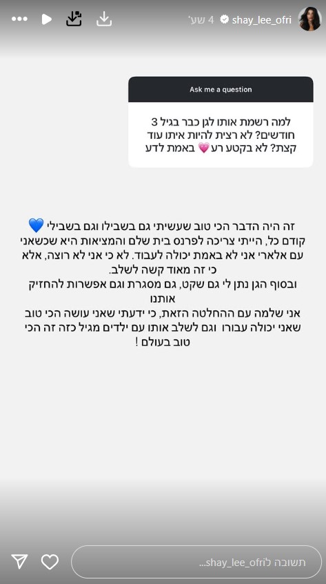 רק לאחרונה כזכור, בסשן שאלות שהכוכבת הישראלית קיימה עם מעריציה, היא התבקשה לספר מדוע היא החליטה לשלוח את בנה לגן כבר כשהיה בן שלושה חודשים. "זה היה הדבר הכי טוב שעשיתי גם בשבילו וגם בשבילי. קודם כל, הייתי צריכה לפרנס בית שלם והמציאות היא שכשאני עם אלארי, אני לא באמת יכולה לעבודה. לא כי אני לא רוצה, אלא כי זה מאוד קשה לשלב.