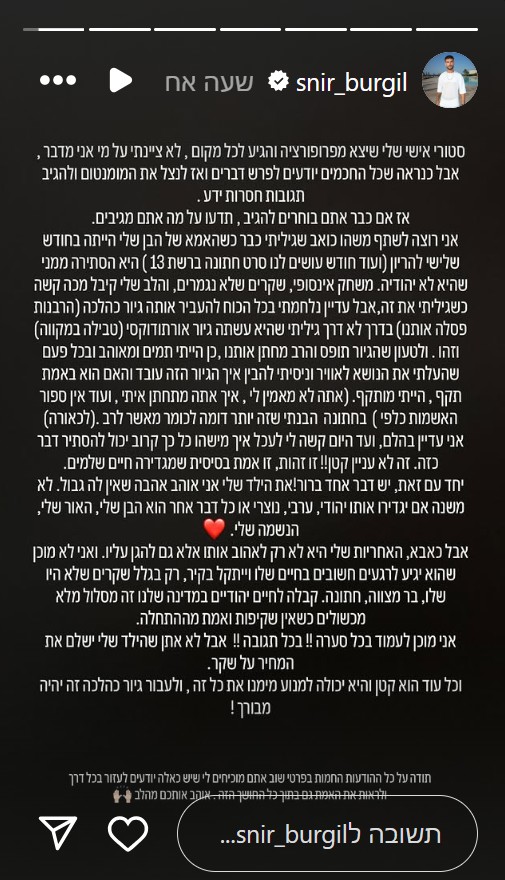 בורגיל סיכם את הפוסט החושפני בפנייה עקיפה לגרושתו, ממנה הוא מצפה לעבור גיור כהלכה כעת: "כל עוד הוא קטן".