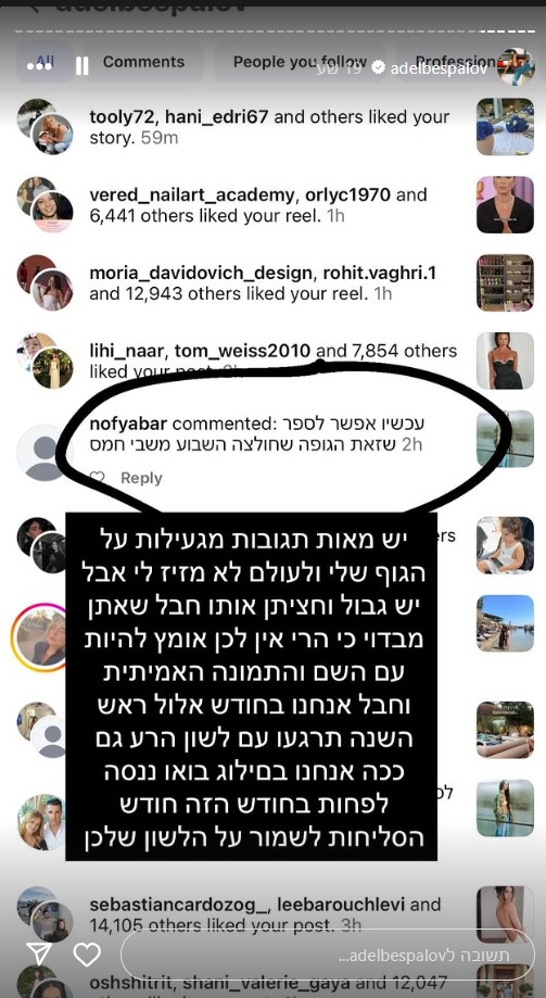 בספלוב ענתה: "יש מאות תגובות מגעילות על הגוף שלי ולעולם לא מזיז אבל יש גבול וחציתן אותו חבל שאתן מבדוי כי הרי אין לכן אומץ להיות עם השם והתמונה האמיתית וחבל אנחנו בחודש אלול, הראש השנה. תרגעו עם לשון הרע, גם ככה אנחנו בפילוג בואו ננסה לפחות בחודש הזה חודש הסליחות, לשמור על הלשון שלכן".