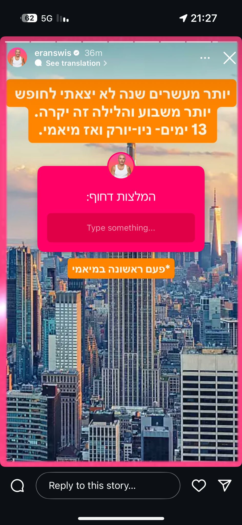 בסטורי כתב: "יותר מעשרים שנה לא יצאתי לחופש יותר משבוע והלילה זה יקרה. 13 ימים - ניו יורק ואז מיאמי". עוד ביקש את המלצותיהם של עוקביו, וסיפר כי יהיה בפעם הראשונה בחייו במיאמי.