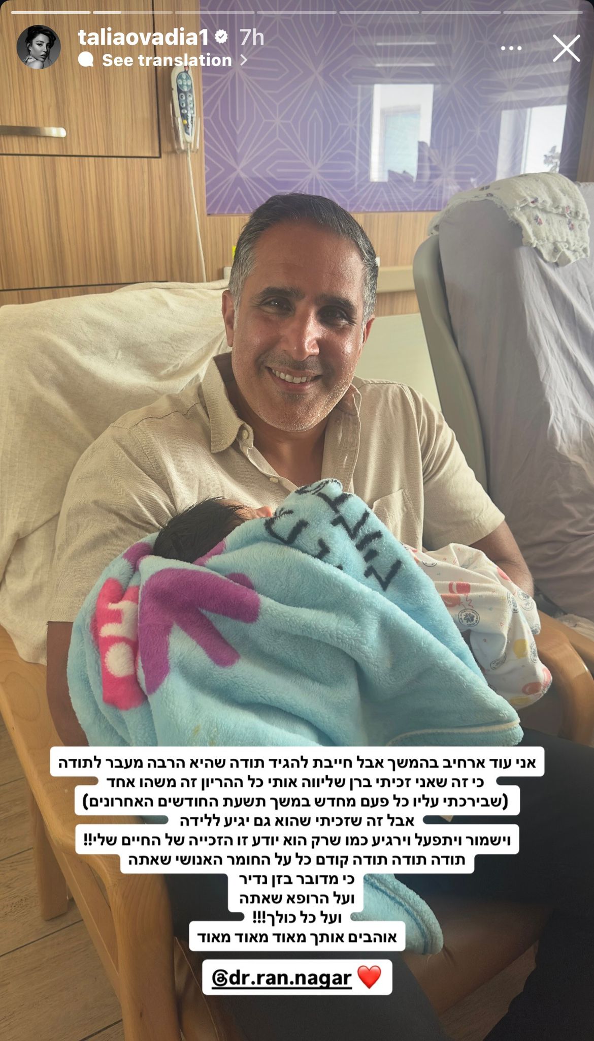 בסטורי לאחר מכן, הודתה לד"ר רן נגר, שליווה אותה לאורך הלידה, כך כתבה: "חייבת להגיד תודה שהיא הרבה מעבר לתודה, כי זה שאני זכיתי ברן ליווה אותי כל ההריון, זה משהו אחד (שבירכתי עליו כל פעם מחדש במשך תשעת החודשים האחרונים) אבל זה שזכיתי שהוא גם יגיע ללידה וישמור ויתפעל וירגיע כמו שרק הוא יודע זו הזכייה של החיים שלי!! תודה קודם כל על החומר האנושי שאתה, כי מדובר בבן אדם נדיר ועל הרופא שאתה, כי מדובר בזן נדיר, ועל כל כולך!!! אוהבים אותך מאוד"; צפו בסטורי.
