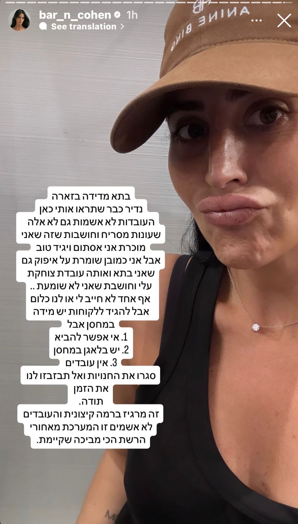 עוד סיפרה על תחושותיה בביקור בחנות: "אף אחד לא חייב לי או לנו כלום, אבל להגיד ללקוחות אל תבואו מדידה במחסן? אבל 1. אי אפשר להביא 2. יש בלגן במחסן 3. אין עובדים, סגרו את החנויות ואל תעבדו לנו את הזמן, תודה. זה מרגיז ברמה קיצונית והעובדים לא אשמים זו המערכת מאחורי הרשת הכי מביכה שקיימת"; צפו בסטורי.