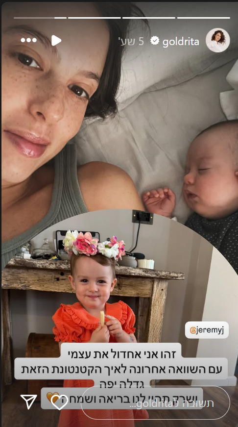 בסטורי שפרסמה כתבה כתבת האוכל של קשת 12: "היום יום הולדת שנתיים לאהבה הקטנה שלי. למדתי בזכות האמהות שלל שיעורים על החיים בשנתיים החולפות ובכל יום לומדת עוד ועוד. עברתי על מלא תמונות מהשנתיים האחרונות ובא לי להעלות הכל אבל אני ארגיע. זהו אני אחדול את עצמי עם השוואה אחרונה לאיך הקטנטונת הזאת גדלה יפה. שרק תהיי לנו בריאה ושמחה".