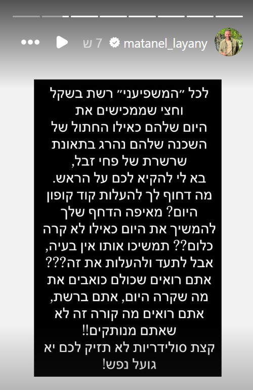 "אתם רואים שכולם כואבים את מה שקרה היום, אתם ברשת, אתם רואים מה קורה, זה לא שאתם מנותקים!!", נזף יוצר התוכן בקולגות והוסיף: "קצת סולידריות לא תזיק לכם יא גועל נפש!".
