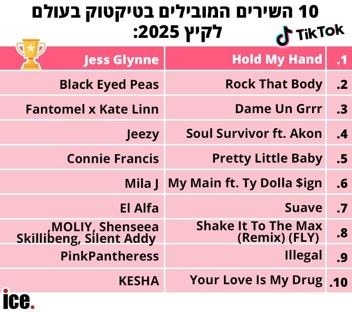 במקביל, פרסמה טיקטוק העולמית לאחרונה את דירוג רשימת שירי הקיץ המובילים בעולם לשנת 2025 – והלהיט הבלתי מעורער במקום הראשון הוא Hold My Hand של ג’ס גלין, הידוע גם בתור "השיר של Jet2holidays", הודות לטרנד שכבש את הרשת. למקום השני התברג Rock That Body של ה Black Eyed Peas-משנת 2009, וגם השיר Pretty Little Baby של קוני פרנסיס המנוחה הפך ללהיט ענק השנה, והשתבץ במקום החמישי ברשימה העולמית, יותר משישה עשורים לאחר יציאתו המקורית.