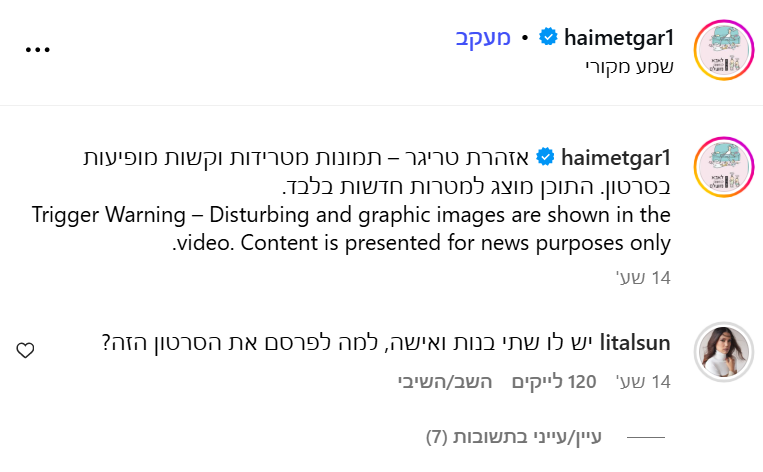 מגיש קשת 12 חיים אתגר פרסם את סרטון הרצח והוסיף אזהרת טריגר: "תמונות מטרידות וקשות מופיעות בסרטון". מגישת ערוץ 14 ליטל שמש לא אהבה את הפוסט וכתבה בתגובה: "יש לו שתי בנות ואישה. למה לפרסם את הסרטון הזה?".