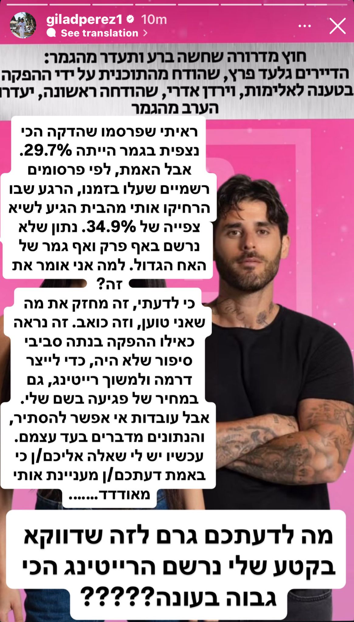 עוד הוסיף: "כי לדעתי, זה מחזק את מה שאני טוען, וזה כואב. זה נראה כאילו ההפקה בנתה סביבי סיפור שלא היה, כדי לייצר דרמה ולמשוך רייטינג, גם במחיר של פגיעה בשם שלי. אבל עובדות אי אפשר להסתיר, והנתונים מדברים בעד עצמם. עכשיו יש לי שאלה אליכם.ן, כי באמת דעתכם.ן מעניינת אותי מאוד.. מה לדעתכם גרם לזה שדווקא בקטע שלי, נרשם הרייטינג הכי גבוה בעונה?"; צפו בסטורי.