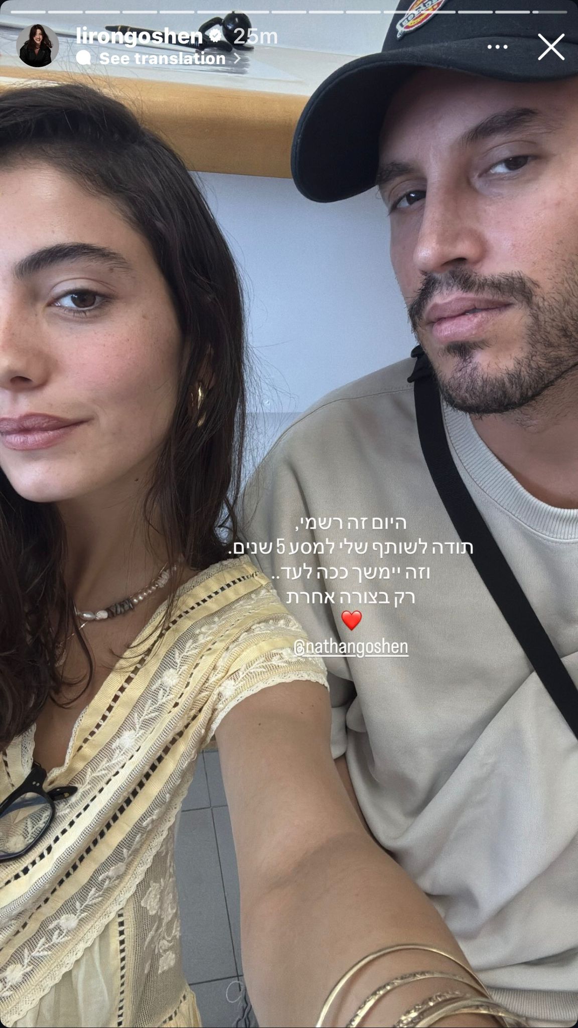 הבוקר (שלישי) לירון שיתפה סטורי משותף שלה ושל נתן, כי השניים התגרשו סופית, כך כתבה: "היום זה רשמי, תודה לשותף שלי למסע 5 שנים, זה יימשך ככה לעד, רק בצורה אחרת" וצירפה אימוג'י לב אדום; צפו בסטורי.