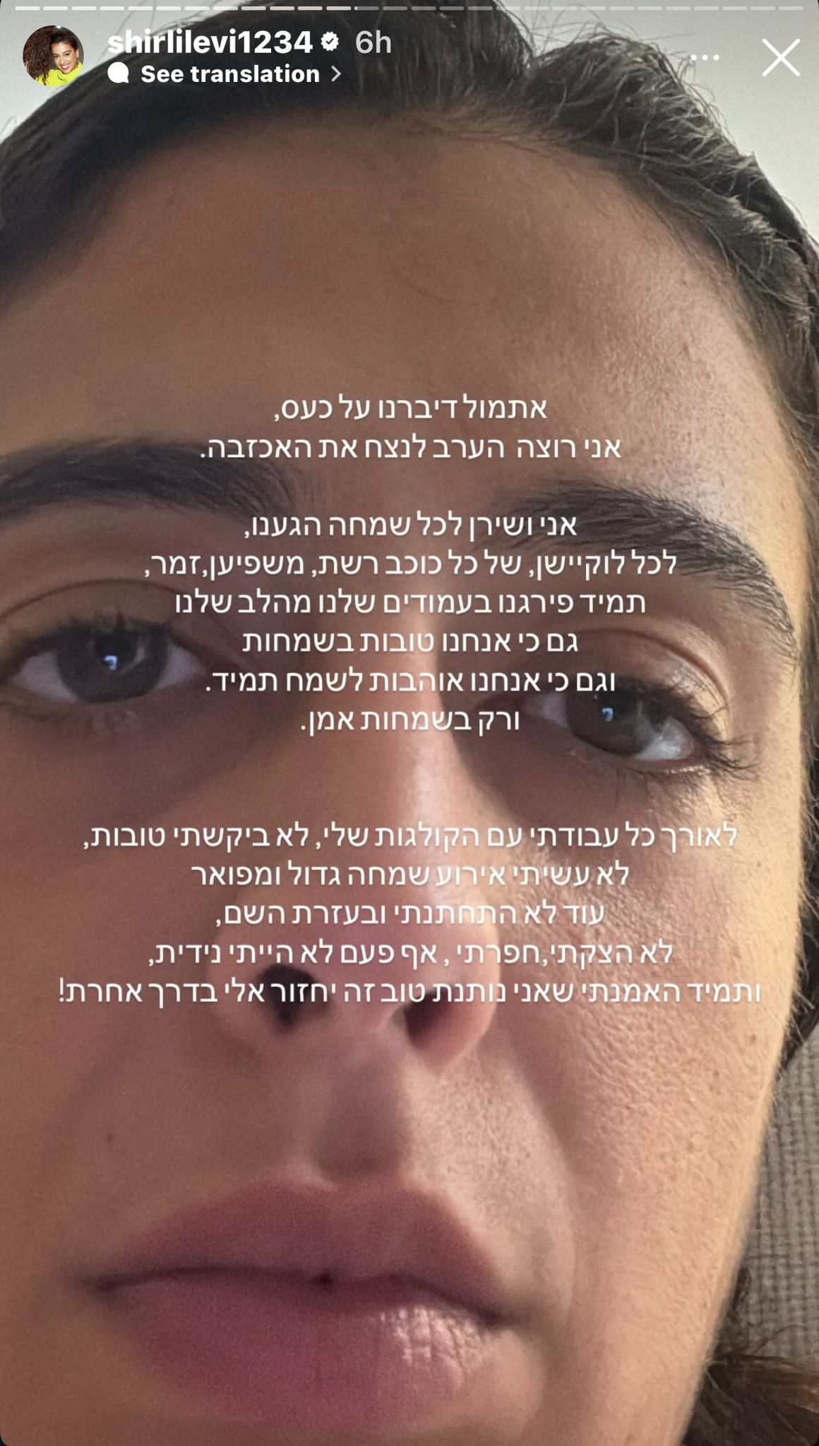עוד הוסיפה לוי: "לאורך כל עבודתי עם הקולגות שלי, לא ביקשתי טובות, לא עשיתי אירוע שמחה גדול ומפואר - עוד לא התחתנתי ובעזרת השם, לא הצקתי, חפרתי, אף פעם לא הייתי נידית, ותמיד האמנתי שאני נותנת טוב זה יחזור אלי בדרך אחרת!"; צפו בסטורי.