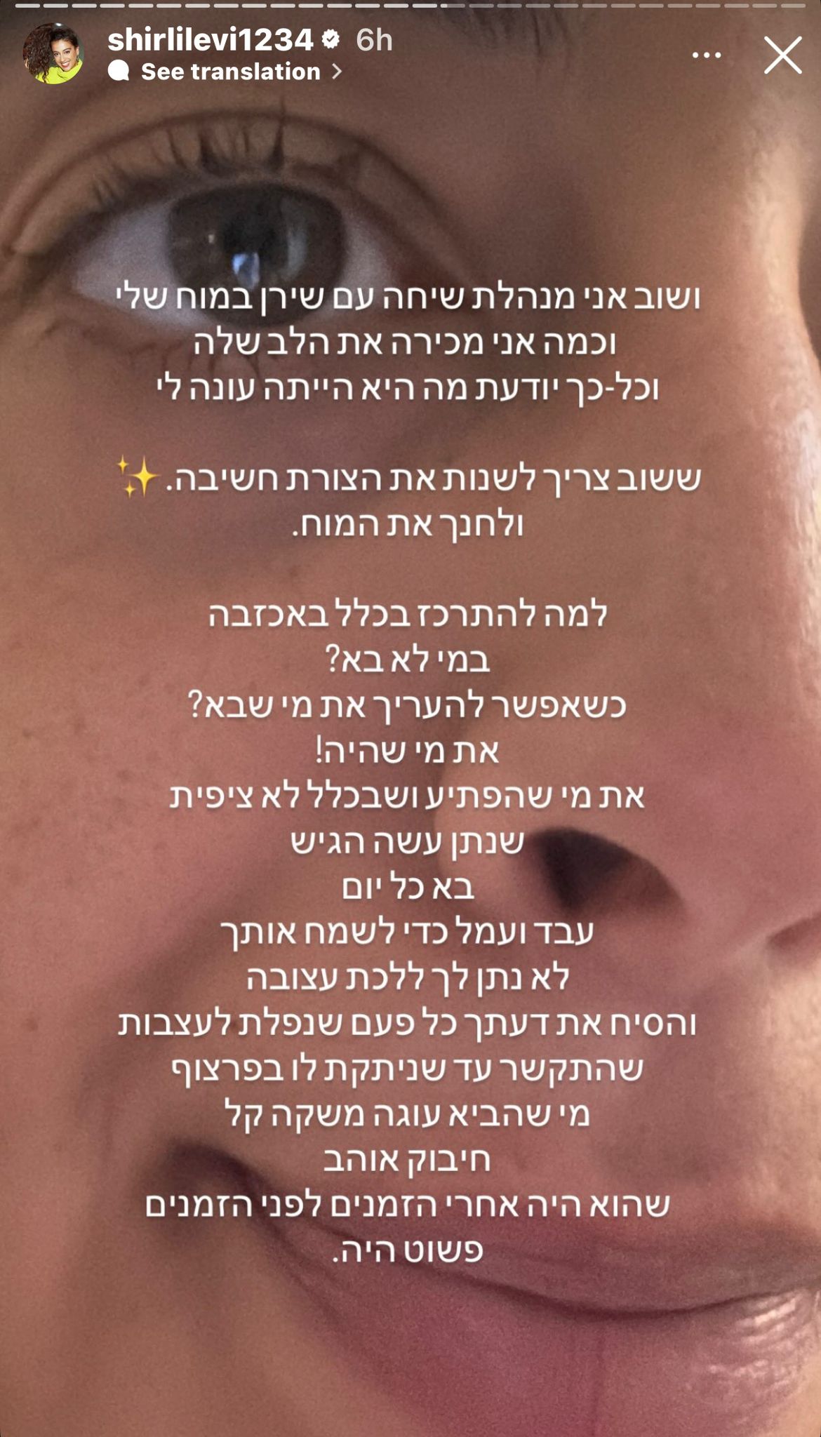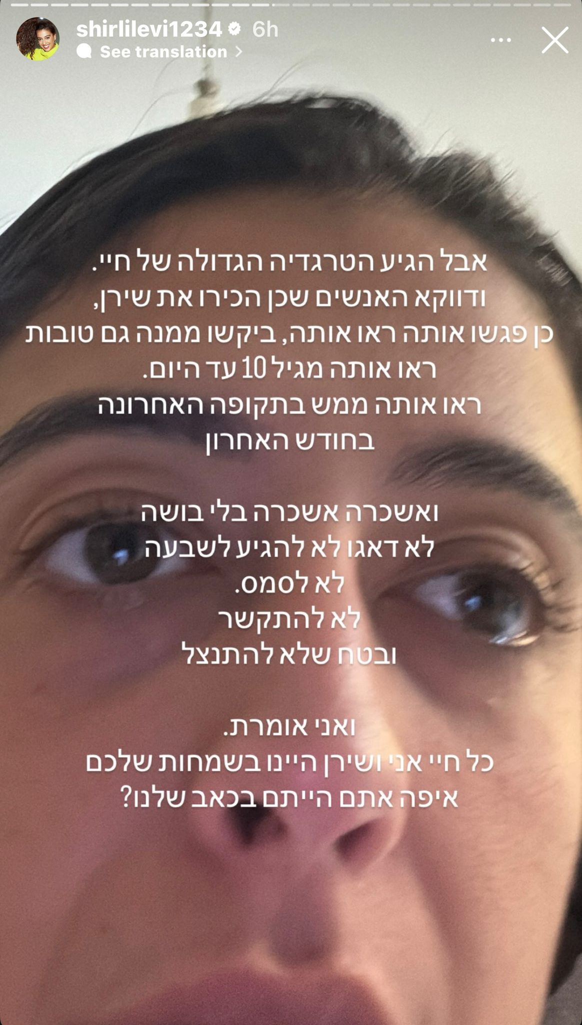 ובסטורי נוסף בעניין, הדגישה את הכרת התודה שלה למי שכן היה לו אכפת ממנה, משירן וממשפחתה, כך כתבה לוי: "ושוב אני מנהלת שיחה עם שירן במוח שלי, וכמה אני מכירה את הלב שלה, וכל-כך יודעת מה היא הייתה עונה לי.