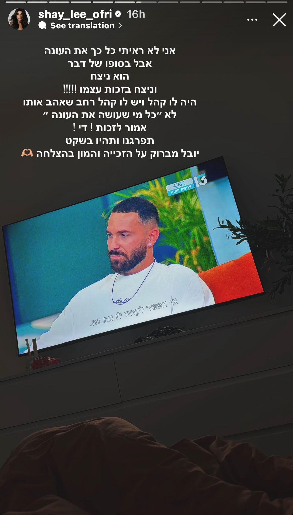 כך כתבה עופרי: "אני לא ראיתי כל כך את העונה, אבל בסופו של דבר הוא ניצח וניצח בזכות עצמו!! היה לו קהל ויש לו קהל רחב שאהב אותו, לא כל מי 'שעונה את העונה' אמור לזכות! די! תפרגנו ותהיו בשקט"; צפו בסטורי.