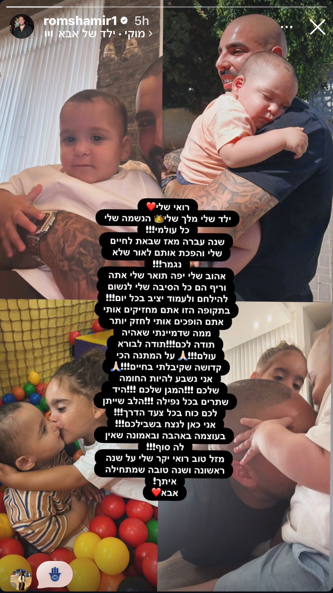 עוד הוסיף: "תודה לכם! תודה לבורא עולם על המתנה הכי קדושה שקיבלתי בחיים! אני נשבע להיות החומה שלכם! המגן שלכם! היד שתרים בכל נפילה! הלב שייתן לכם כוח בכל צעד בדרך! אני כאן לנצח בשבילכם! בעוצמה, באהבה ובאמונה שאין לה סוף! מזל טוב רואי יקר שלי על שנה ראשונה ושנה טובה שמתחילה איתך! אבא".