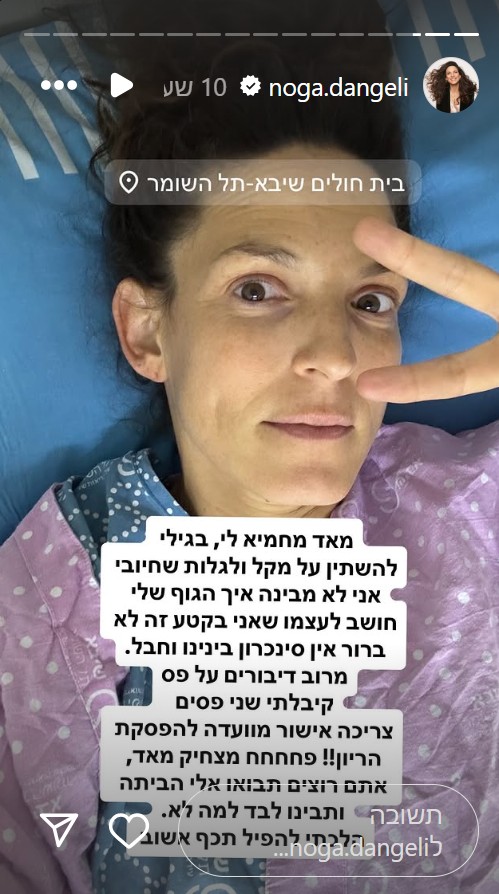 הקומיקאית, שצירפה תמונה שלה שכובה על מיטת בית החולים והוסיפה תנועת וי באצבעותיה, התייחסה בהמשך בציניות גם לצורך לקבל אישור להפלה על פי חוק: "צריכה אישור מוועדה להפסקת היריון!!! פחחחח מצחיק מאוד, אתם רוצים, תבואו אליי הביתה ותבינו לבד למה לא. הלכתי להפיל תיכף אשוב", סיכמה השחקנית את האירוע.