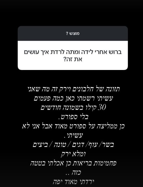 עוד הוסיפה כהן: "כן ממליצה על ספורט מאוד אבל אני לא עשיתי", וחשפה את עיקרי תפריט הדיאטה הבסיסי שלה: "בשר/עוף/דגים/טונה/ביצים ומלא ירק. פחמימות בריאות כן אכלתי – בטטה כזה. ירדתי מאוד יפה".