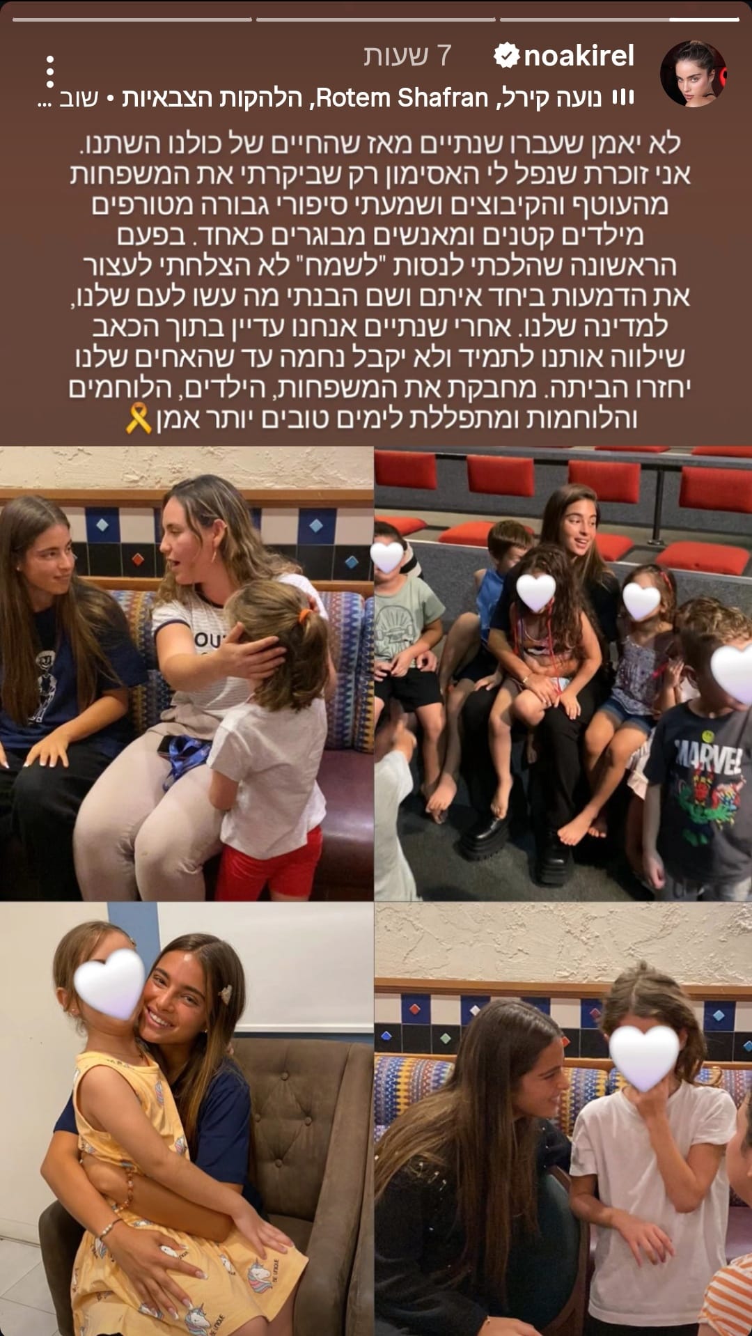 הזמרת בת ה-24, ששיתפה תמונות מהמפגשים שלה עם ילדי העוטף לאחר ה-7 באוקטובר ומדברים ששיתפה עינב צנגאוקר, הוסיפה כי הפצע של ה-7 באוקטובר ירפא רק כאשר יחזרו כל החטופים : "אחרי שנתיים אנחנו עדיין בתוך הכאב שילווה אותנו לתמיד ולא יקבל נחמה עד שהאחים שלנו יחזרו הביתה. מחבקת את המשפחות, הילדים, הלוחמים והלוחמות ומתפללת לימים טובים יותר. אמן".