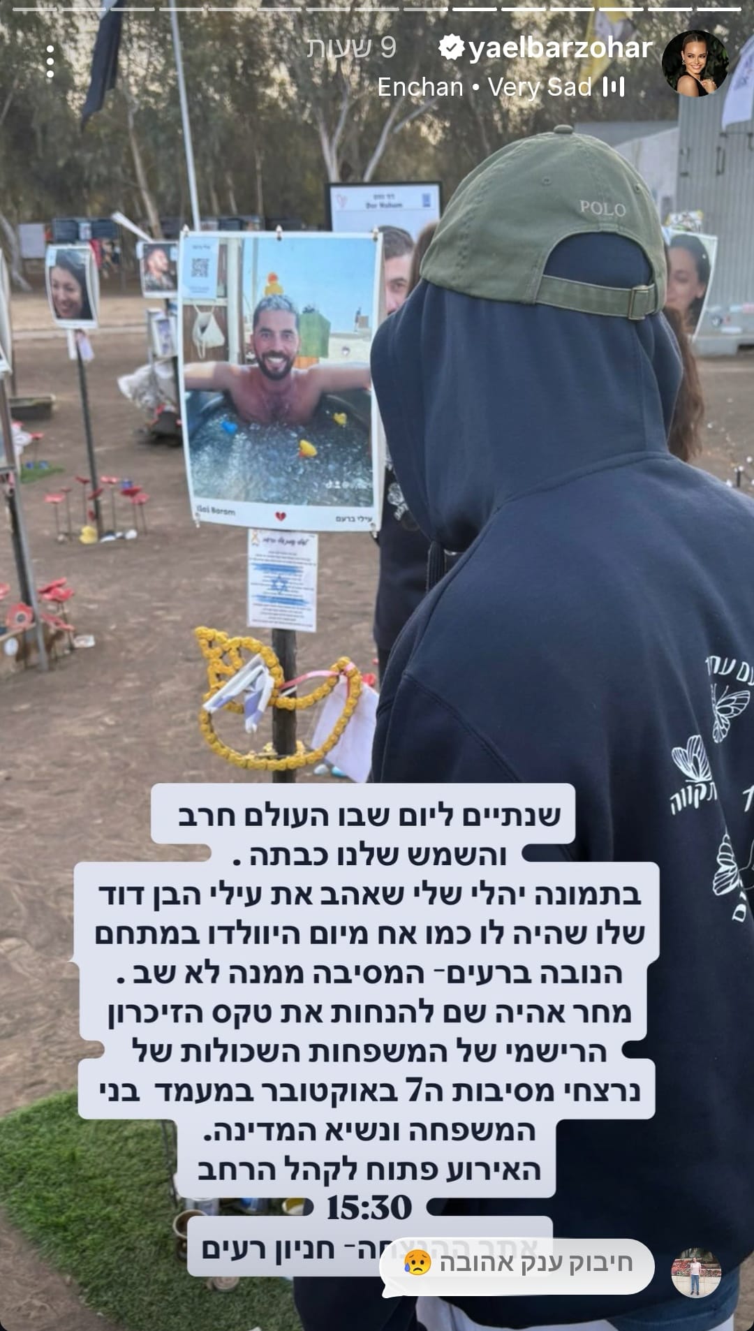 "שנתיים ליום שבו העולם חרב והשמש שלנו כבתה", כתבה בר זוהר שצפויה להנחות היום (רביעי) את טקס הזיכרון הרשמי של המשפחות השכולות של נרצחי מסיבות ה-7 באוקטובר בחניון רעים. המגישה ששיתפה תמונה שמתעדת את בנה ניצב מול תמונתו של ברעם באתר הזיכרון לנרצחי הפסטיבל, הוסיפה: "יהלי שלי שאהב את עילי הבן דוד שלו שהיה לו כמו אח מיום היוולדו במתחם הנובה – המסיבה ממנה לא שב".