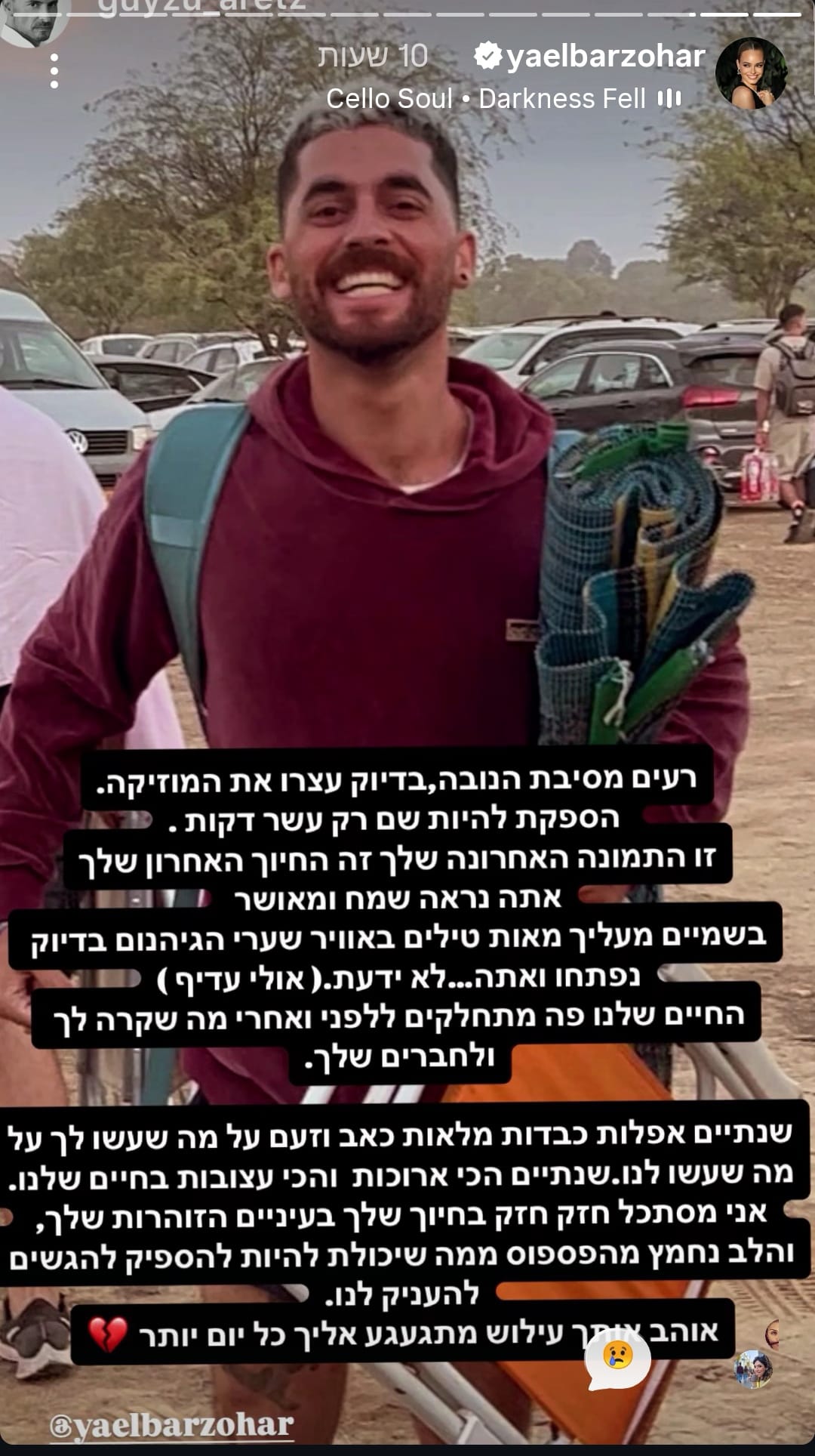 עוד כתב זו-ארץ: "החיים שלנו פה מתחלקים ללפני ואחרי מה שקרה לך ולחברים שלך. שנתיים אפלות, כבדות, מלאות כאב וזעם על מה שעשו לך, על מה שעשו לנו. שנתיים הכי ארוכות והכי עצובות בחיים שלנו... הלב נחמץ מהפספוס ממה שיכולת להיות, להספיק, להגשים, להעניק לנו. אוהב אותך עילוש. מתגעגע אליך כל יום יותר".