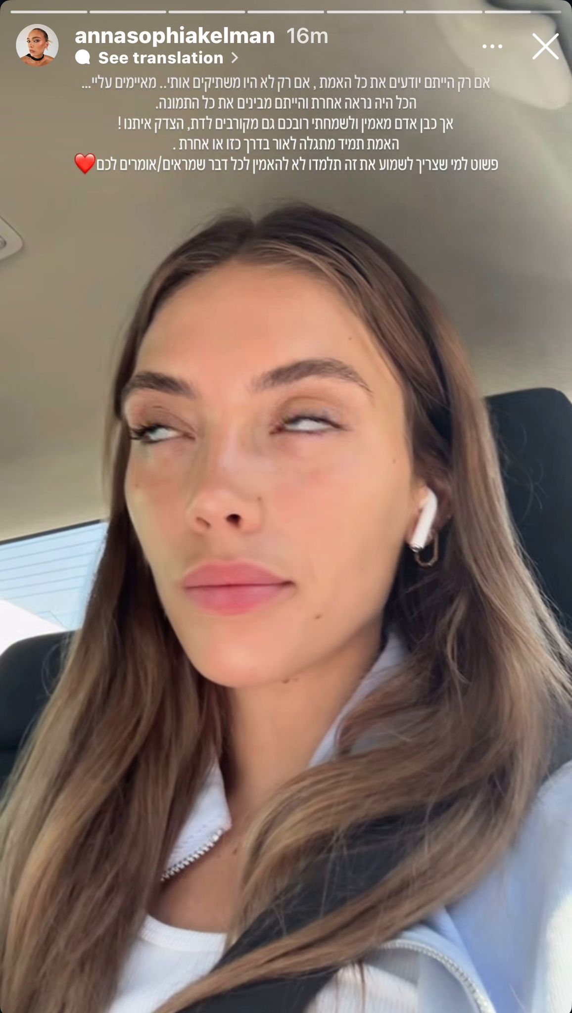 "אך כן אדם מאמין ולשמחתי רובכם גם מקורבים לדת, הצדק איתנו! האמת תמיד מתגלגלת לאור בדרך כזו או אחרת. פשוט למי שצריך לשמוע את זה תְּלַמְדוּ לא להאמין לכל דבר שמראים/אומרים לכם"; צפו בסטורי.