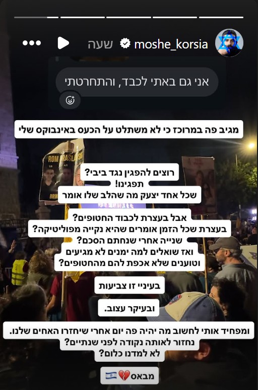 "רוצים להפגין נגד ביבי? תפגינו! שכל אחד יצעק מה שהלב שלו אומר", הבהיר כורסיה. "אבל בעצרת לכבוד החטופים? בעצרת שכל הזמן אומרים שהיא נקייה מפוליטיקה? שנייה אחרי שנחתם הסכם? ואז שואלים למה ימנים לא מגיעים וטוענים שלא איכפת להם מהחטופים? בעיניי זו צביעות ובעיקר עצוב", הוסיף כוכב הרשת וסיכם את האירוע בחשש מפני העתיד: