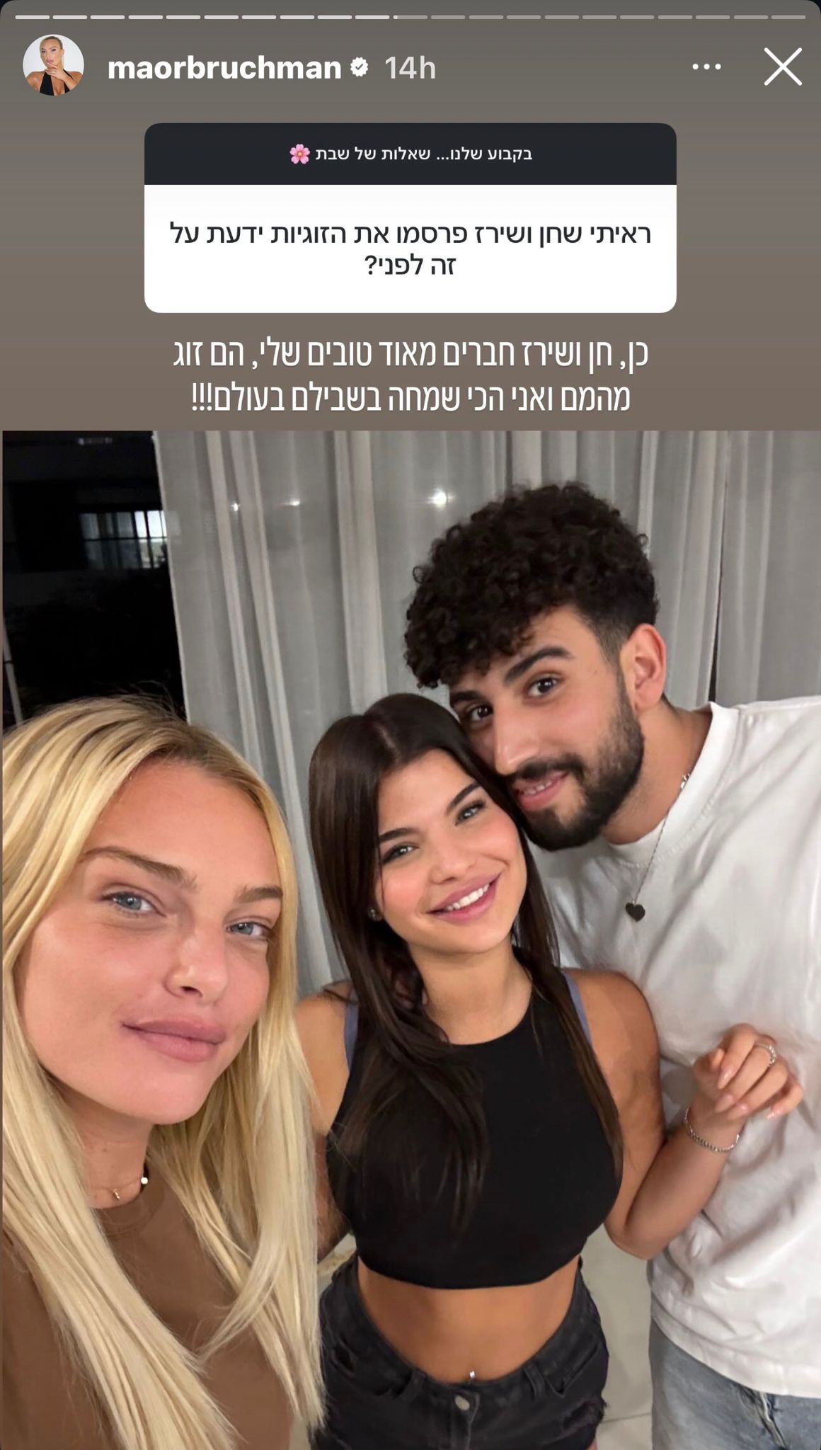 כך כתבה על גבי תמונה משותפת של שלושתם: "כן, חן ושירז חברים מאוד טובים שלי. הם זוג מהמם, ואני הכי שמחה בשבילם בעולם!"; צפו בסטורי.