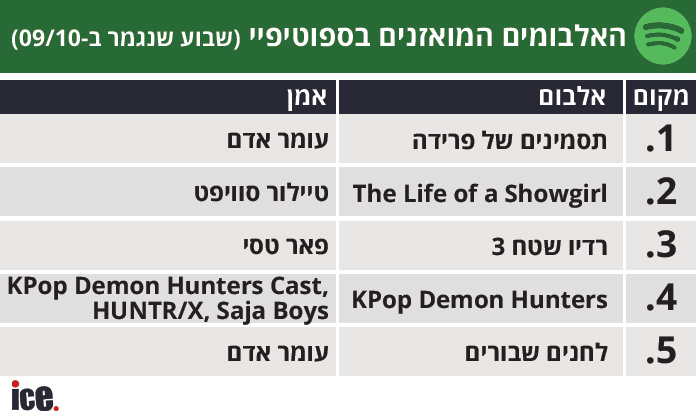 רדיו שטח 3 של פאר טסי יורד למקום השני. אלבום הקיי פופ של סאג'ה בויס "KPOP DEMON HUNTERS" נשאר במקום הרביעי ו"לחנים שבורים" של עומר אדם מדיח את רדיו שטח 2 ונועל את הרשימה.