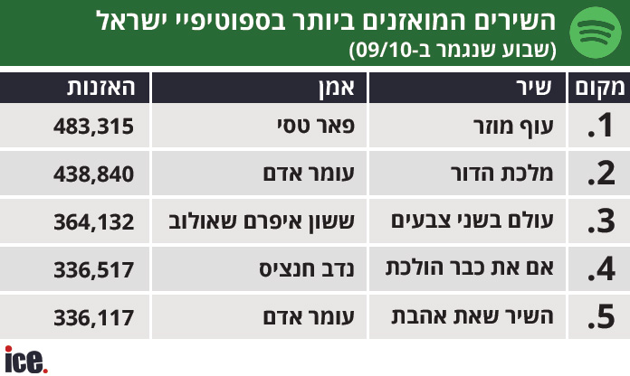 ברשימת האמנים המושמעים בספוטיפי ישראל, עומר אדם ממשיך גם במהלך חג הסוכות לככב בראש. מי שצמוד אליו הוא פאר טסי, אודיה עולה למקום השלישי לאחר שפרסמה 3 שירים לאחרונה.